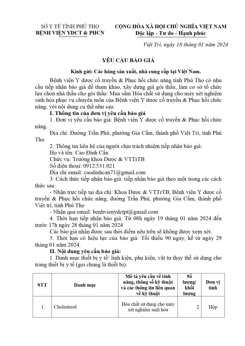 YỀU CẦU BÁO GIÁ HÓA CHẤT SINH HÓA